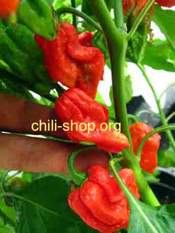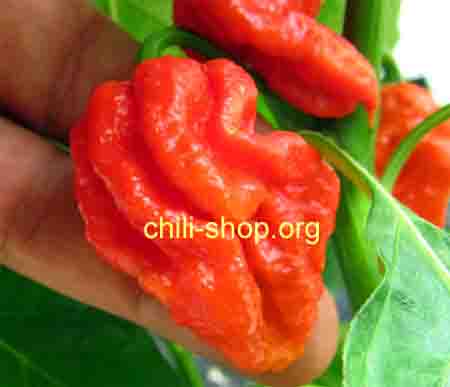 eine rote Variante aus einer Kreuzung von Dorset Naga und 7 Pot Brain Strain Chili